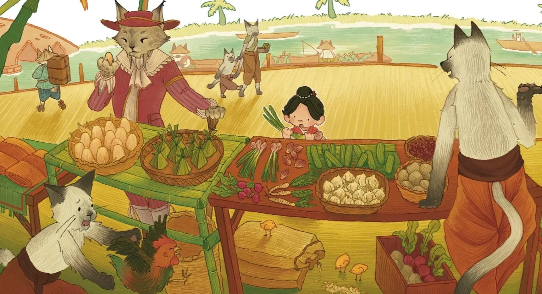 The Market Spread is filled with produce and meat accurate to the time. I used Simone de La Loubére’s 1693 record of the Kingdom of Siam as a reference, along with interviews with historians.