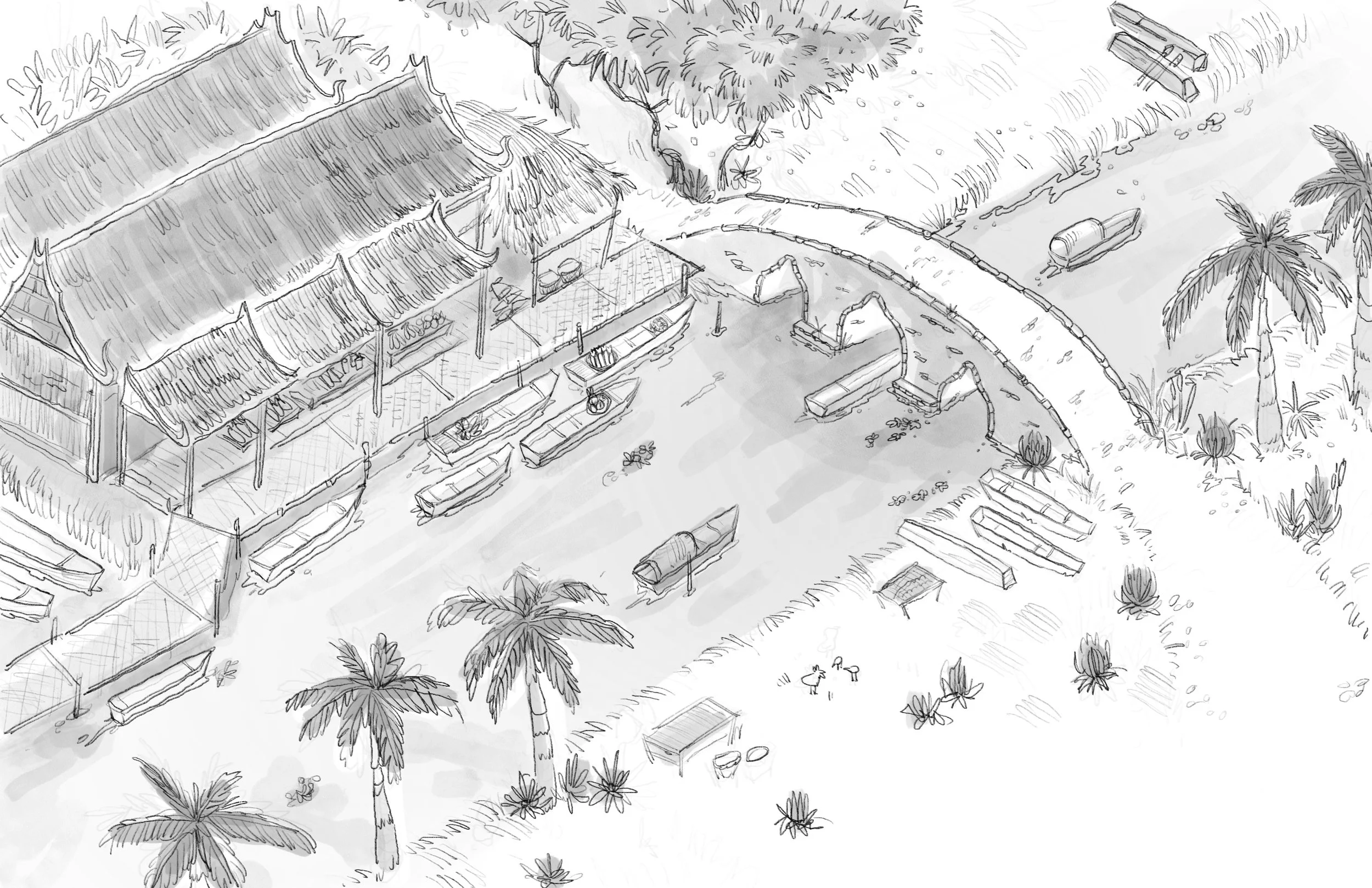 Ayutthaya was a big Kingdom, but the first location I developed was the Floating Market. The design was inspired by the ruins of the ‘Wanon’ Bridge- still standing today at Ayutthaya, Thailand. I designed the surrounding based of research into how waterways were the main source of transport for this Kingdom.