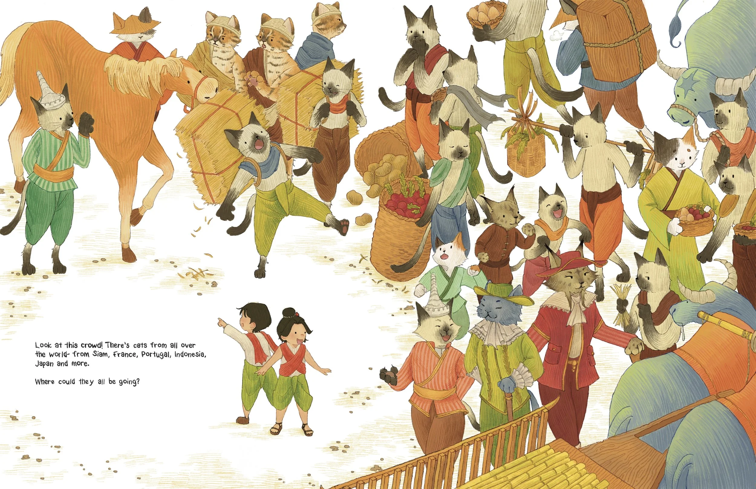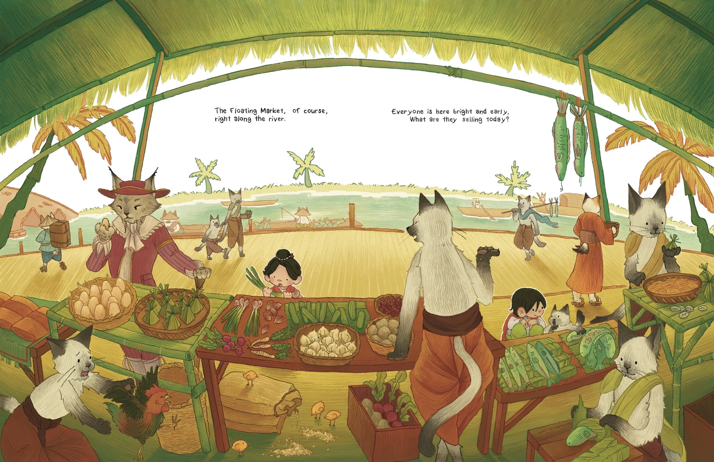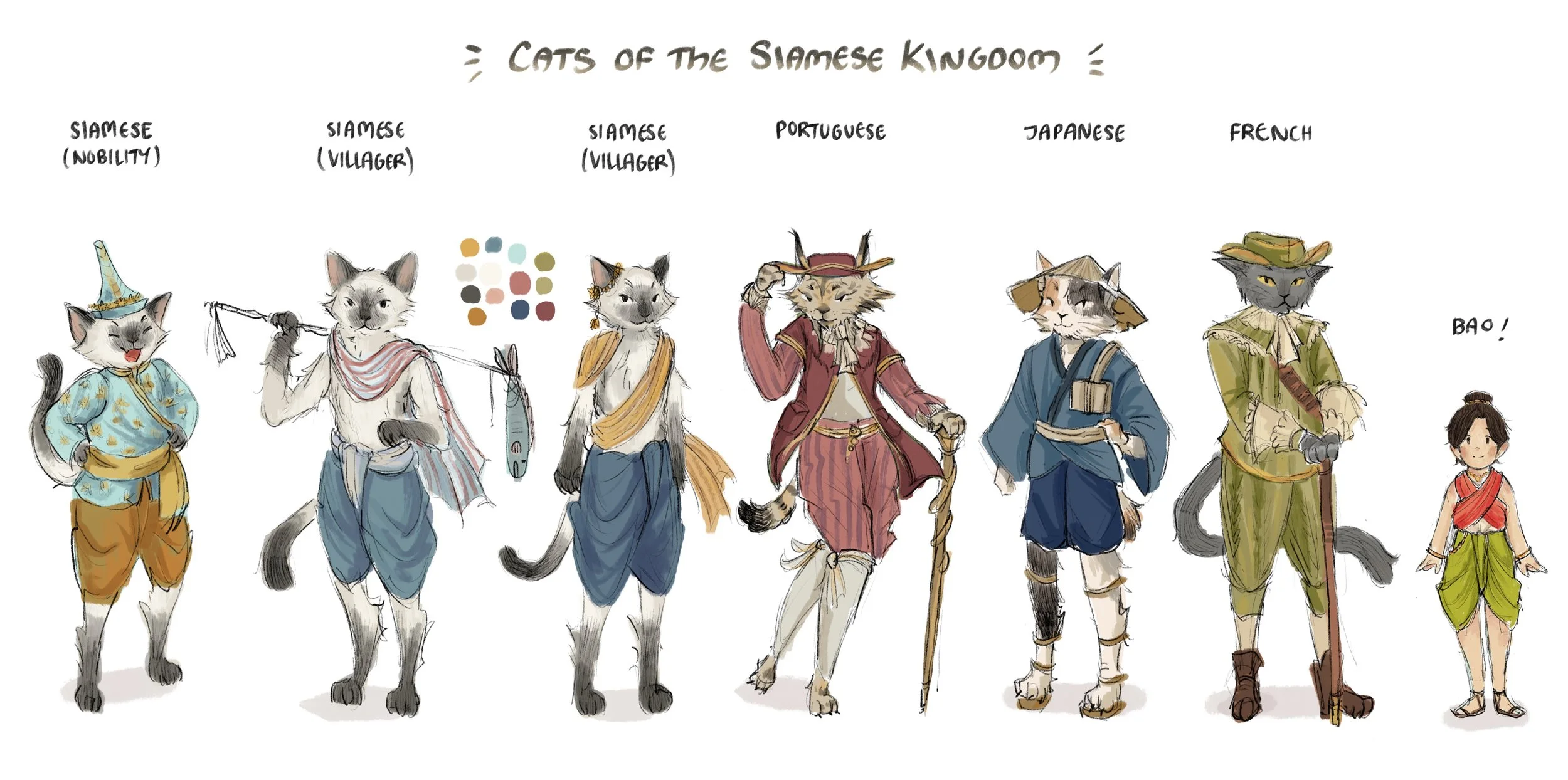 To the Siamese Cat Kingdom!’ is a concept for a children’s book I’ve researched and illustrated about one of Thailand’s most longest lasting kingdoms- Ayutthaya. Follow two twins- Bon and Bao- into the Siamese Kingdom during the Ayutthaya period, a time of prosperous trade and global relations and learn about the lives of the people (cats!) of the past.