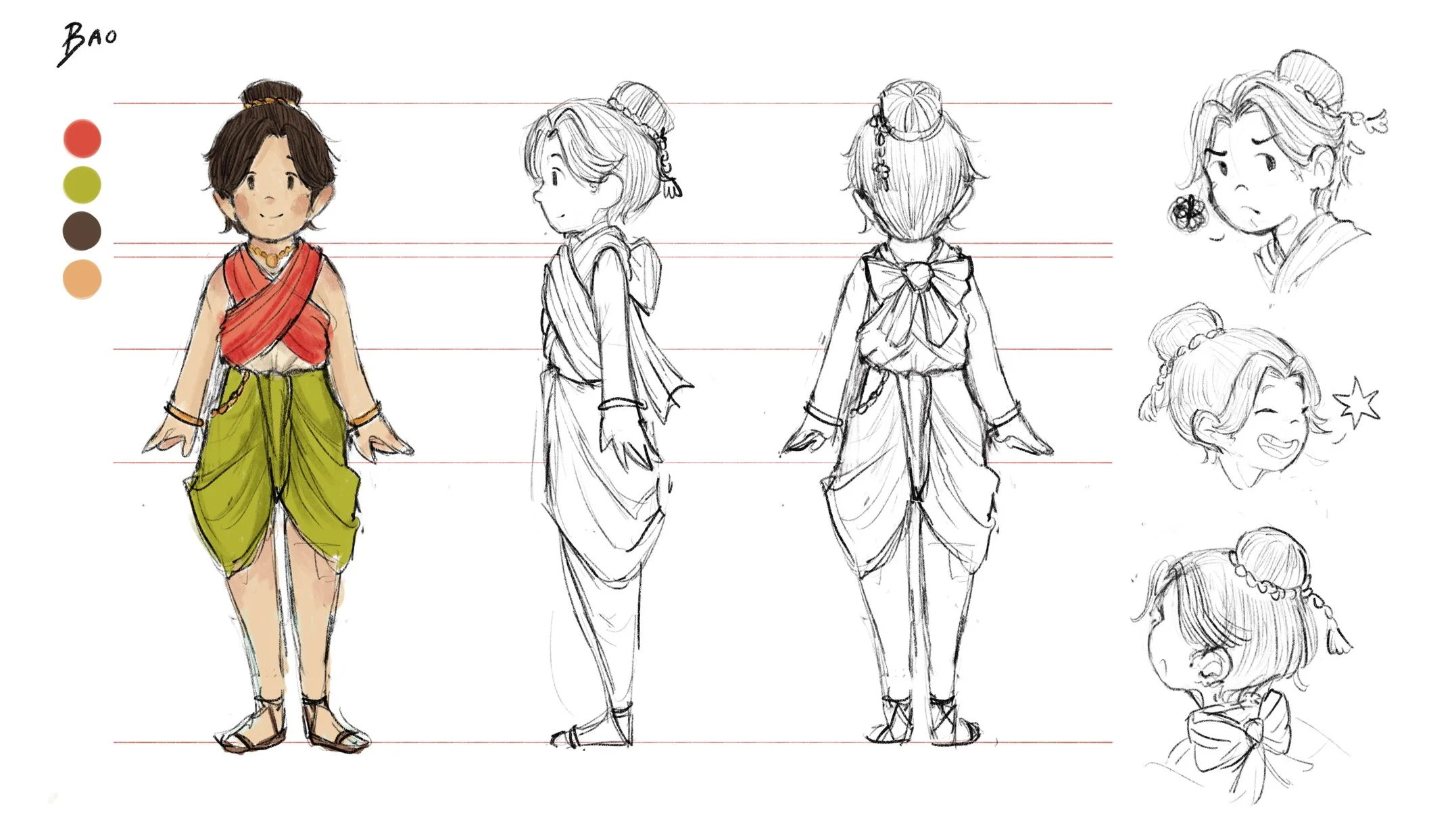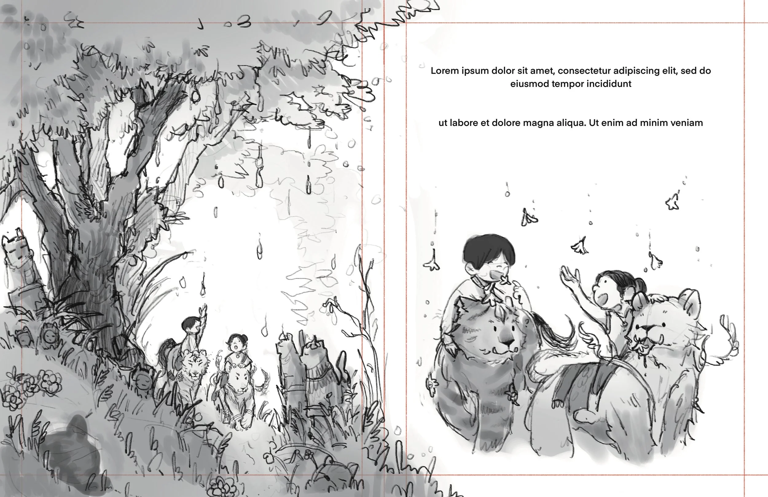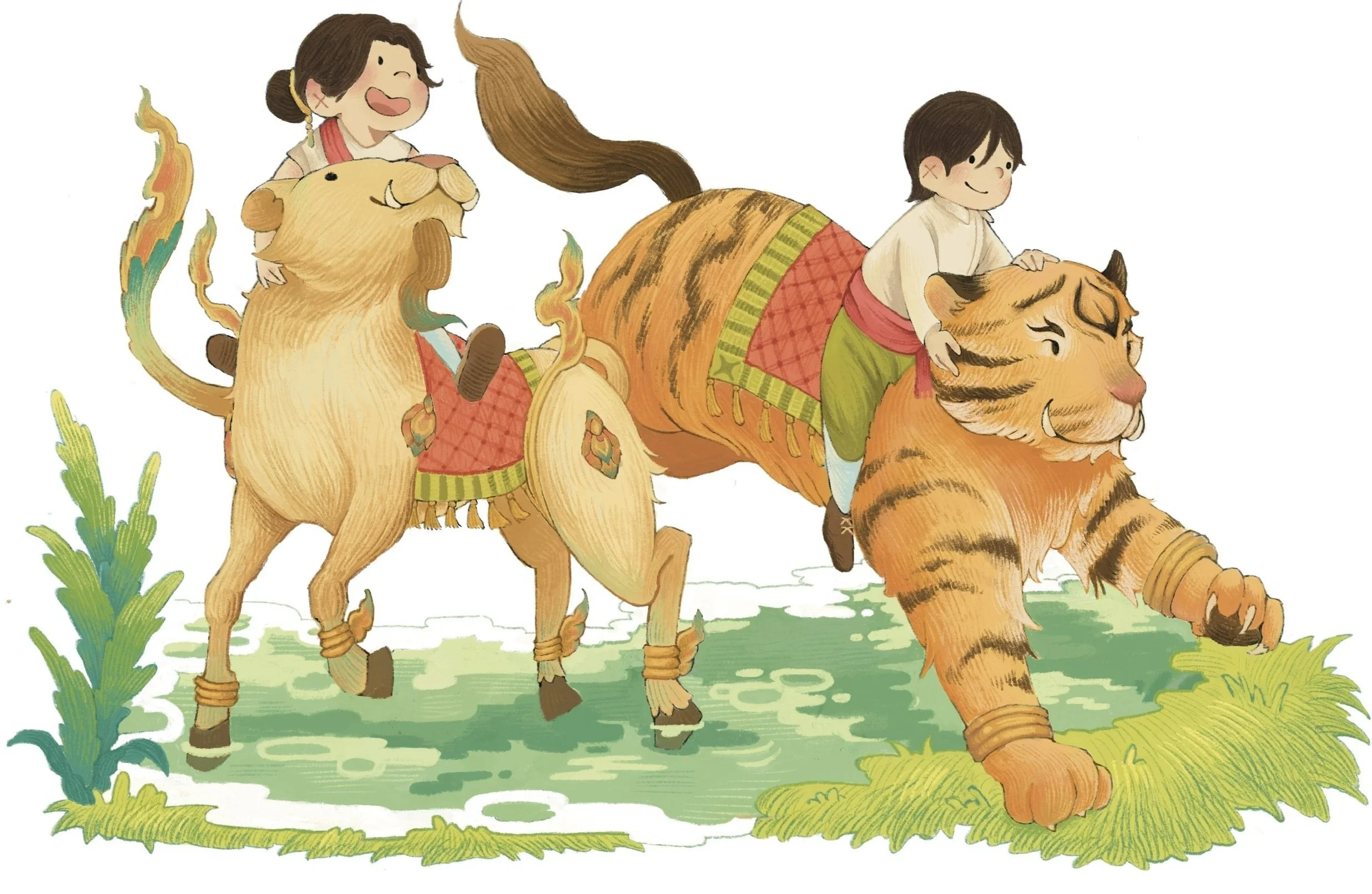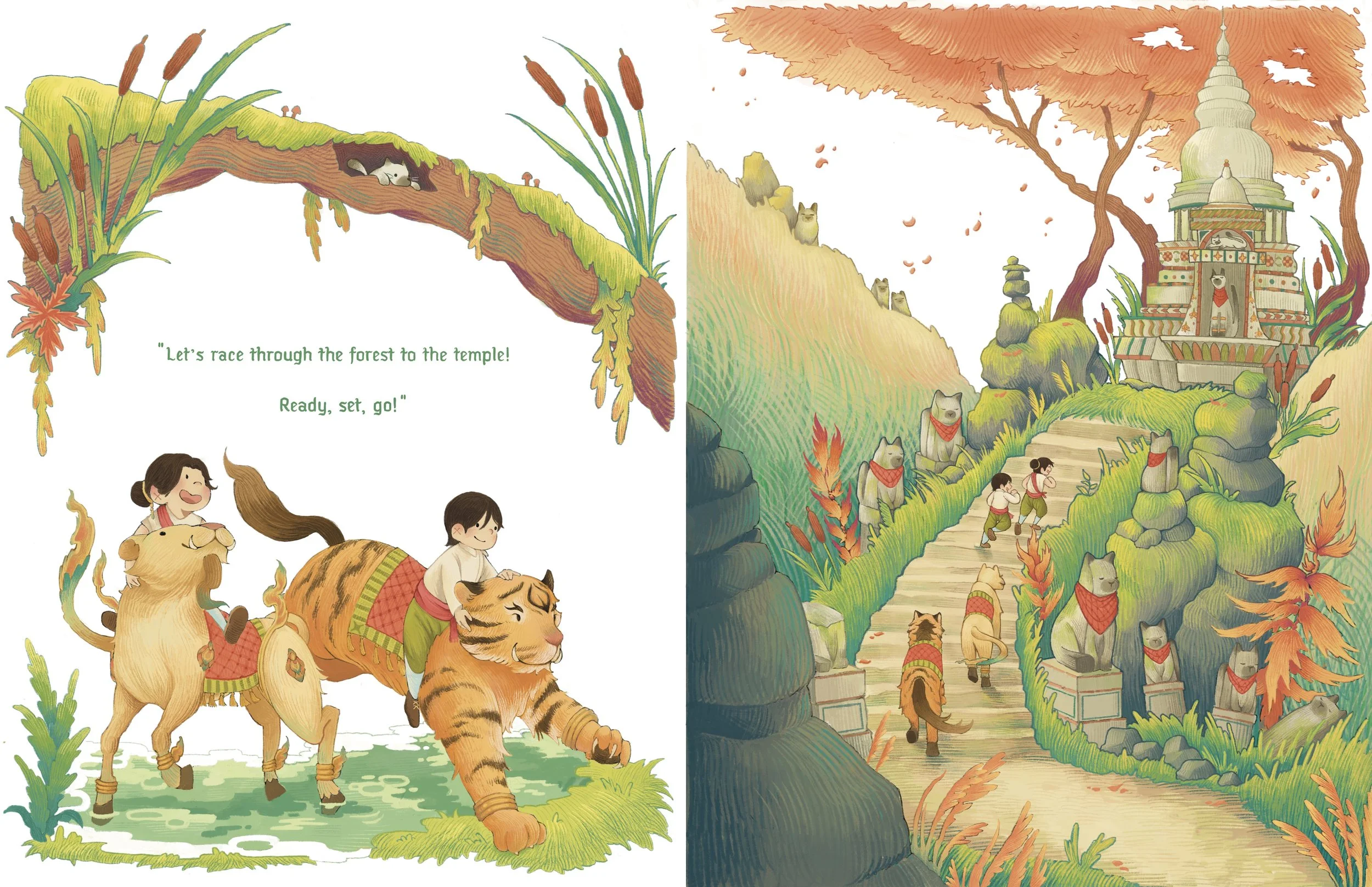 Bon and Bao are twins who live in modern day Thailand. They are a tag team duo, chaotic and curious. They are a brought over to the Siamese Kingdom by a Lion and Tiger, the guardians of the Kingdom. Mirroring the young reader, they are the characters who initiate the interactions that allows information to be delivered.