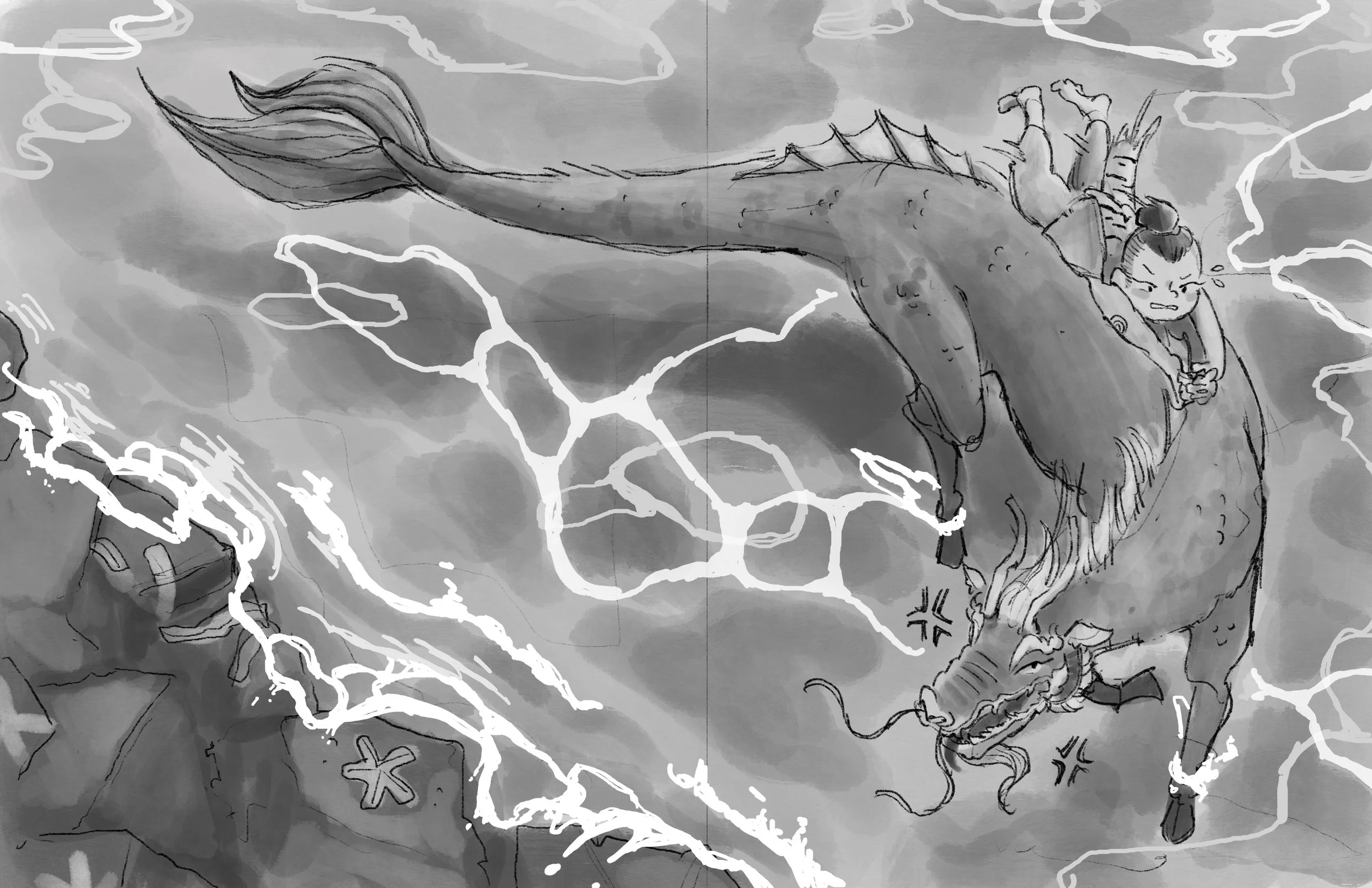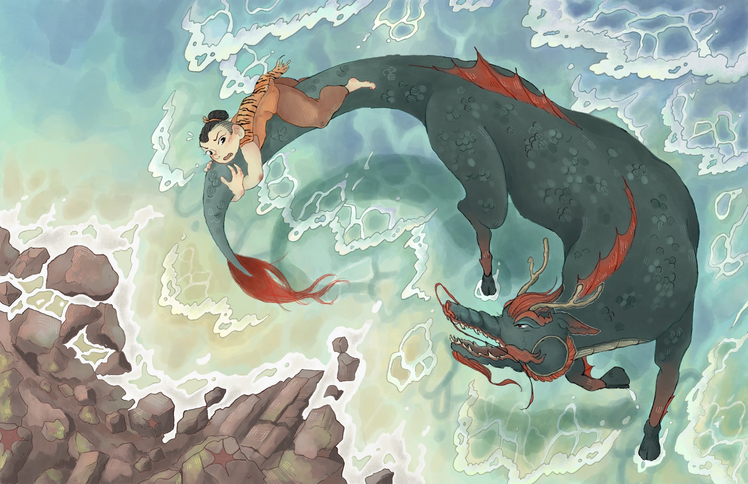 My interpretation of a scene from a popular Thai story— ‘Phra Aphai Mani’ written by Sunthorn Phu. This scene features the kid Sudsakorn as he struggles to tame a dragon-horse.